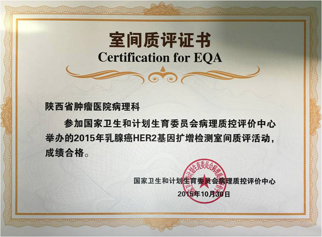 10月份,素股病理科参加了由国家卫生和计划生育委员会病理质控中心举办的“2015年肺癌ALK基因融合检测和乳腺癌HER2基因扩增检测室间质评活动”,成绩优异,并取得了合格证书。这标志着素股荧光原位杂交实验操作流程规范,判读准确。