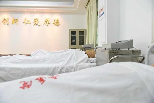 培育新人、提高医技的重要环节,扩大的“医学基本技能训练室”和 “护理基本技能训练室”可模拟心肺复苏训练和模拟医疗穿刺训练,以及静脉穿刺、口腔护理、胃肠减压和导尿等基本护理训练,可供多人同时进行训练观摩。
