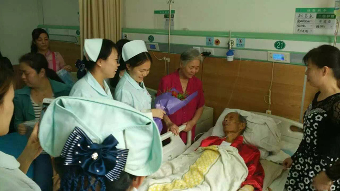 赵大爷感动的连声说道:“谢谢大家,谢谢大家,真没想到你们工作这么忙还能记得我的生日!”。赵奶奶更是感动的红了眼眶,她说:“谢谢天使姑娘们!”。护士张晓婷赶忙安慰落泪的赵奶奶和赵大爷:“大爷,您要放宽心,好好养病,我们一起努力战胜疾病!”。床旁为给老人过生日而聚在一起的子女们也连连说“谢谢你们,谢谢你们替我们照顾老人的健康,还这么细心给他过生日,我们感到很惊喜,也很温暖。”