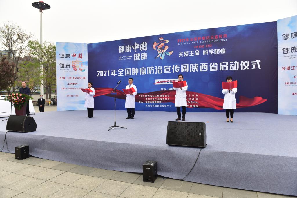 和蒲城县医务人员共同宣读《陕西省防癌抗癌宣传周倡议书》)