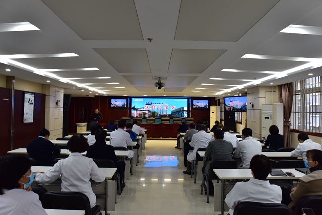 原党委书记徐永刚教授进行授课,部分院领导、临床、医技及行政后勤部门负责人共计100余人参加了会议。