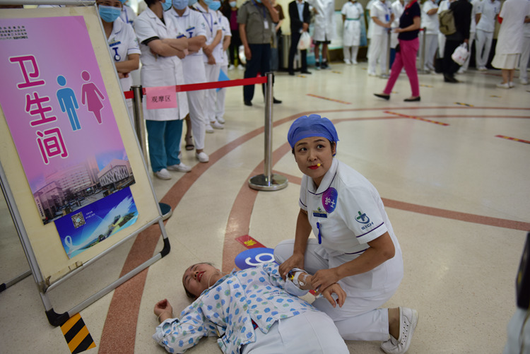 启动仪式上,乳腺病院医、护、患团队表演了科普情景剧,生动形象地向公众展示了新冠疫情自我防护知识和方法。内一A病区进行了患者跌倒应急处理的模拟情境演练。