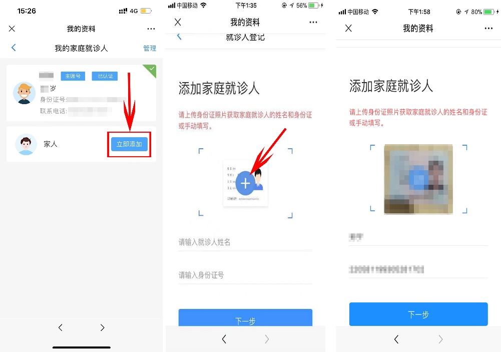 (2)点击“立即添加”,进入到填写家庭就诊人界面,点击手机中部“+”,上传身份证照片,系统会自动识别添加人的姓名和身份证号码,或者手动输入,点击下一步,对家庭就诊人进行实名认证。