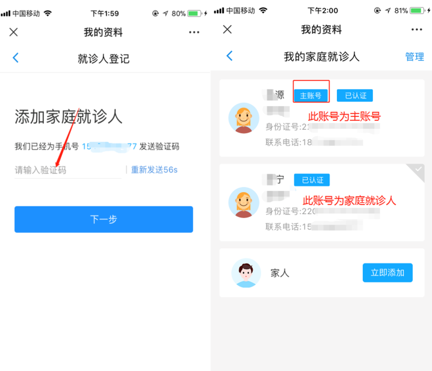 (3)系统会发送一条验证码至被添加人的手机上,输入验证码,家庭就诊人添加成功。