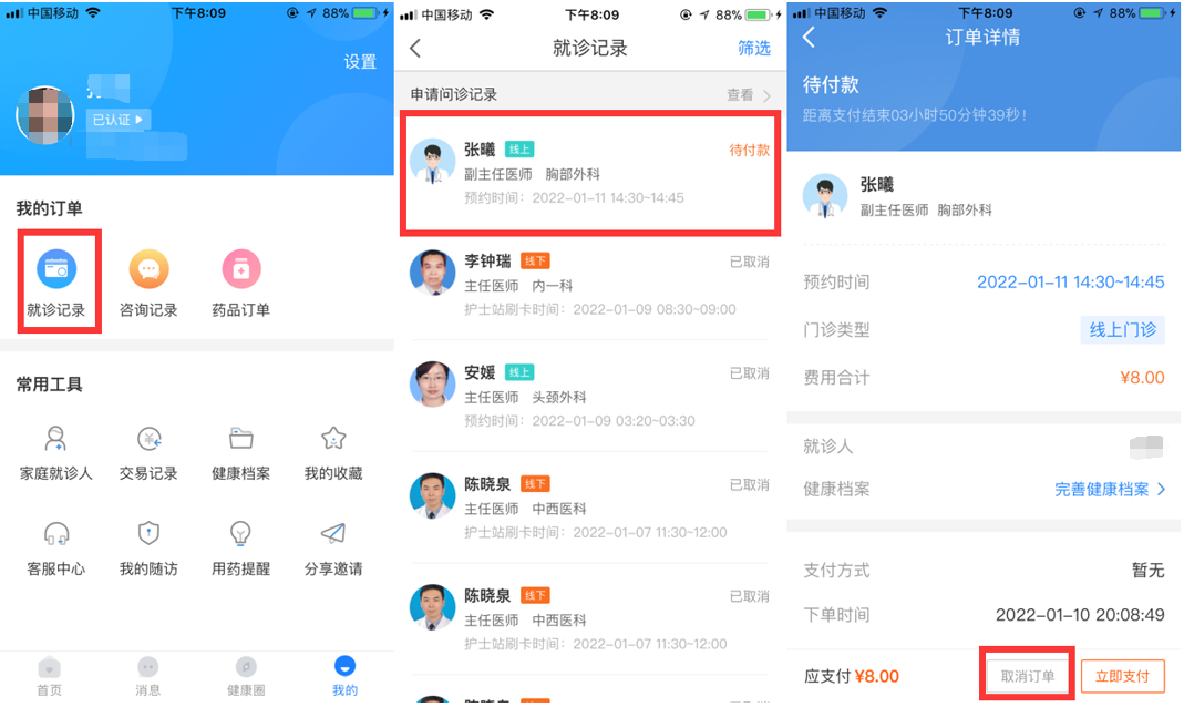 1、取消【视频问诊】预约,医生发起视频问诊前,您可以在就诊记录中,选择订单,在订单详情中点击取消订单。