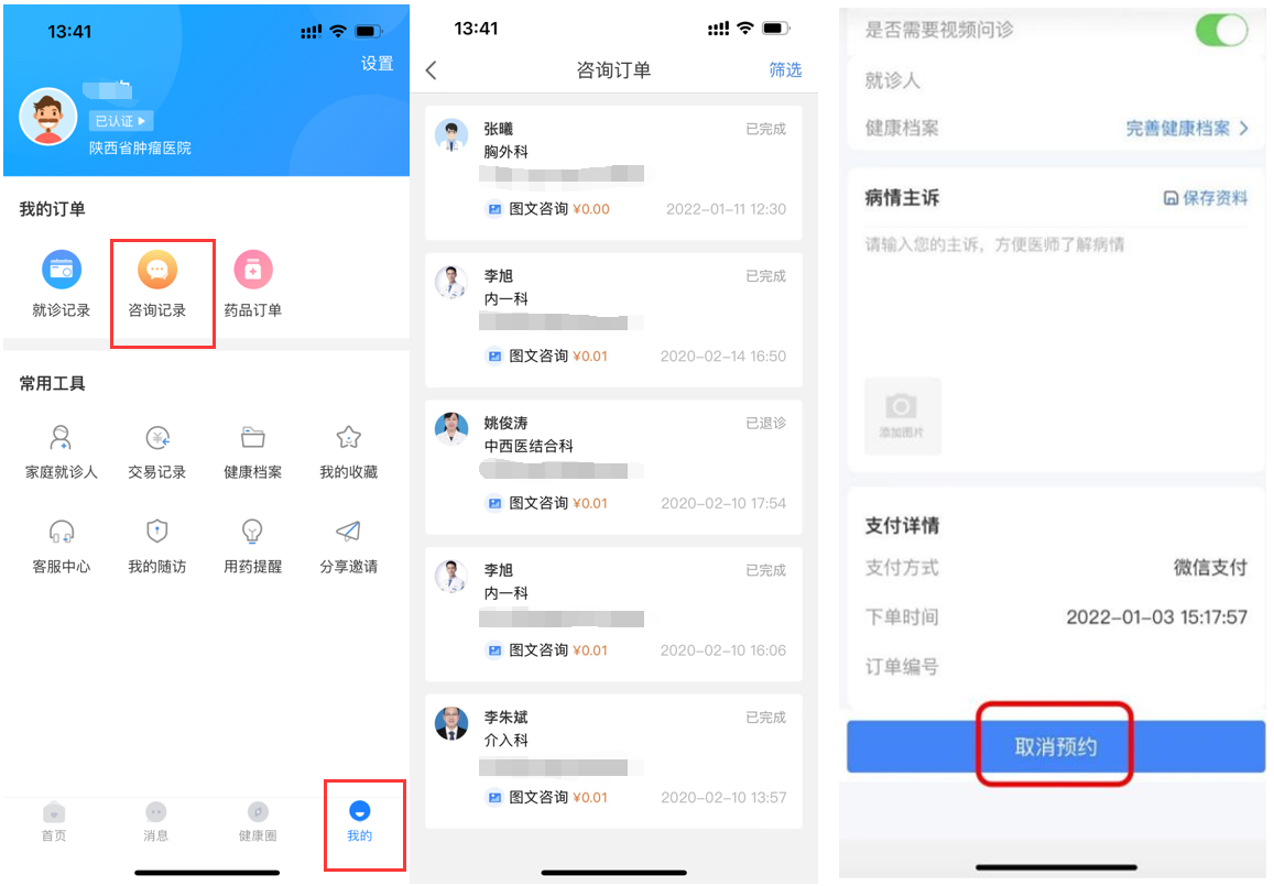 2、取消【复诊咨询】预约,医生接诊前,您可以在咨询记录中取消咨询订单。