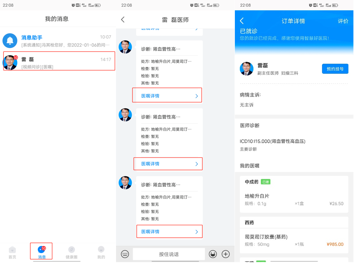 在APP中选择消息,选择医生,可查看医生开立的处方信息。