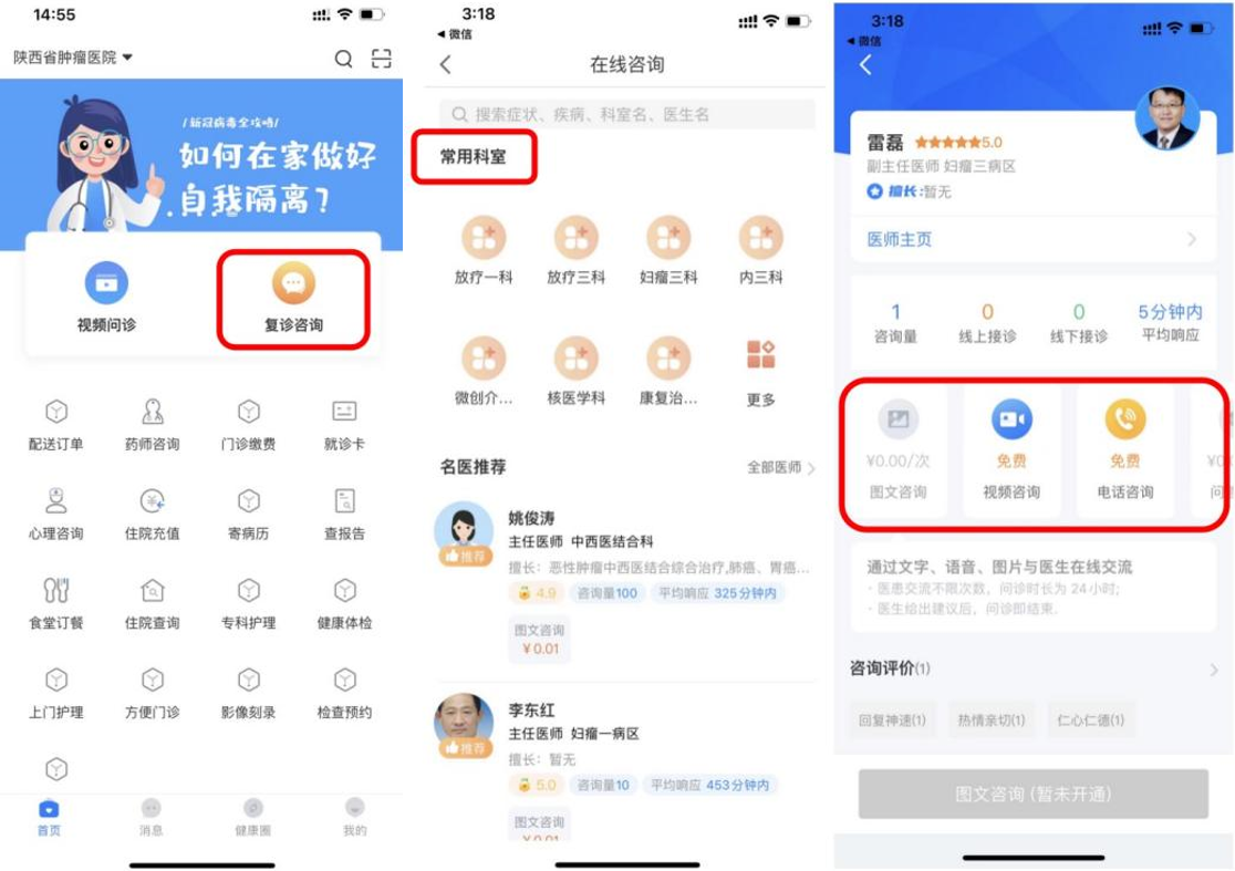 1、素股点击【复诊咨询】按钮,选择咨询的科室和医生,并在医生主页选择咨询方式。