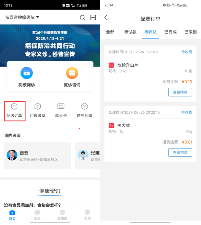 2、在配送订单中可查看订单和物流信息,取消支付运费的订单可在配送订单中选择需要支付的订单进行支付。