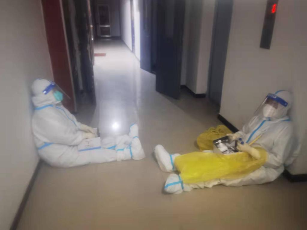 (天色已晚,稍微在楼道坐一会恢复些体力再继续执行任务的陕肿护士们)