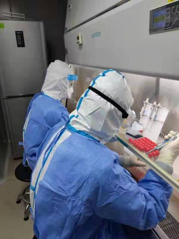 (防护服密不透风,正常人穿上就会感觉呼吸不畅,胸闷憋气,但检测人员要穿戴这些“战袍”连续数小时不吃不喝进行一系列繁琐而精准的操作。)