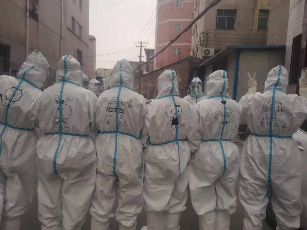 为了方便辨认,大家都会在防护服背后写上自己的名字。后来在全国的采样队中逐渐演变沿袭为一种创作,不经意间成了采样队伍里一道道靓丽的风景线。正面瞧过去,她们每个人都被遮的严严实实的,直到采样结束转身过去,群众才会从背后看到她们的名字。