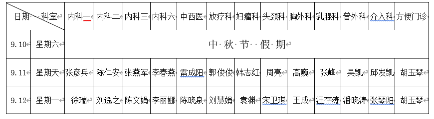 2022年9月10日休假1天,9月11日-9月12日门诊开放时间为上午8:00-12:00。值班科室包括专家门诊、方便门诊、内镜中心、放射科、CT室、检验科、心电图室、B超室、病理科、核医学科、西药房、收费处、医保办、核酸检测同步进行。