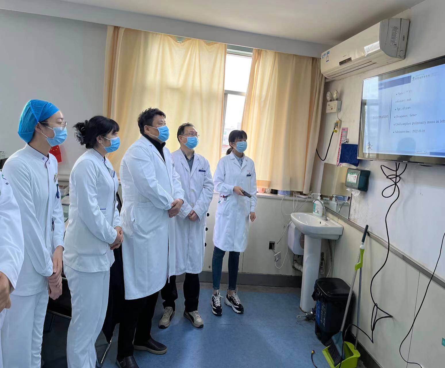 赵征主任用英语介绍了本次查房的目的与要求,住院医师李索妮用英语就一位肺癌患者的基本信息、病史、查体、入院后相关检查结果进行陈述。陈述过程中大家给予了相应补充。之后,赵主任对该疾病的诊疗进行了系统的分析,提出各种问题,李索妮医生进行了一一解答,其他医生和护士进行了补充。查房结束后,赵征主任利用小讲课ppt的形式,针对患者病情制定了相应诊疗方案,对患者的病情特点进行详细分析,并对所选治疗方案依据进行相关阐述。
