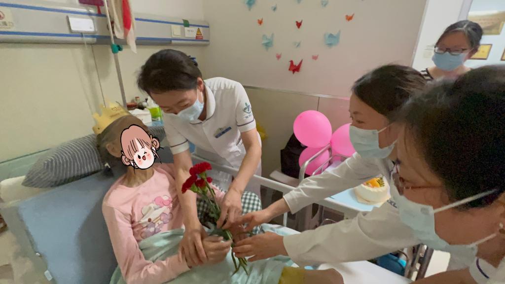 屈奶奶是安宁疗护病房的一位患者,端午佳节,恰逢屈奶奶生日,医护人员特意为奶奶送上了生日的祝福。屈奶奶年事已高、病情危重,安宁护士引导屈奶奶的家人,为奶奶擦拭身体、洗漱、整理衣物,用软垫给奶奶取舒适卧位。医护人员将精心准备的礼物,手工缝制的香包、千纸鹤,鲜花和蛋糕送给奶奶。平日里屈奶奶睡眠较多,今天她梳着俩个小辫,看上去是那么的可爱与安详,在听到生日祝福歌的时候,她缓缓的睁开了眼睛,感觉到她的眼睛瞬间明亮,随后奶奶的双手也不自觉的随着音乐的节拍动起来,嘴里也跟着哼起了生日快乐歌,在场的所有人都露出了会心的笑容。