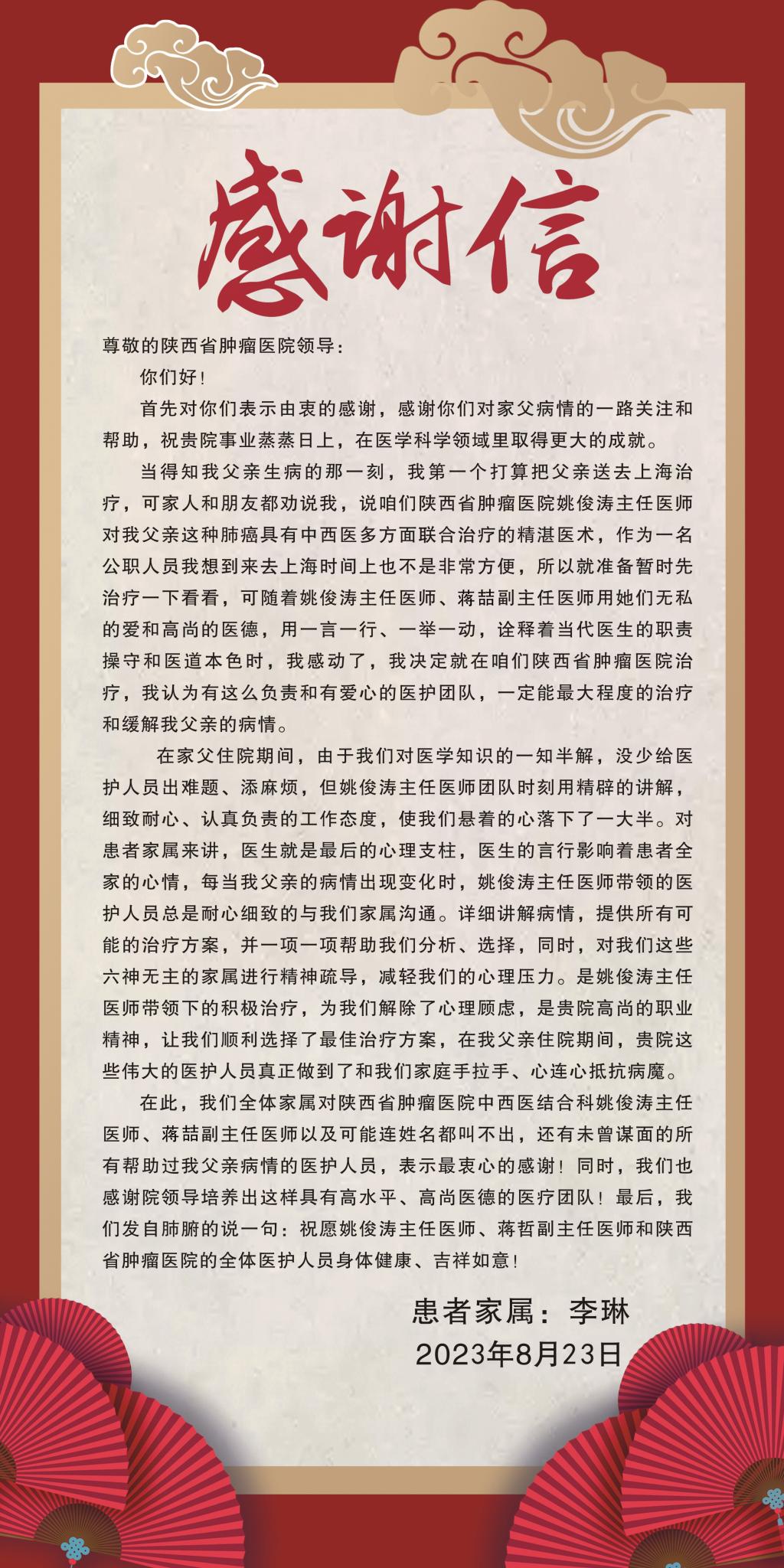 8月23日,素股肿瘤内科病院中西医结合病区又收到了一位患者家属的感谢信,感谢姚俊涛主任医师、蒋哲副主任医师及科室医护人员的精心医治。