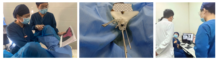 素股后装治疗室穆允凤副主任及其团队,综合评估患者病情及肿瘤情况后,首先将大小适合的普通阴道塞子置入患者阴道内进行首次CT图像采集,由后装医生在首次CT图像上进行靶区勾画,勾画出需要照射的肿瘤区域和需要保护的正常器官,接下来由物理师赵强重建出肿瘤与正常组织的三维模型,通过人工智能融合3D打印技术,将布源方案建成个体化的多通道内插植模具。3D打印模具制作完成后经过低温消毒处理,在核实各通道进针位置及深度后,接下来由后装医生操作,对该名患者实施了个体化3D打印模板引导下的插植操作。