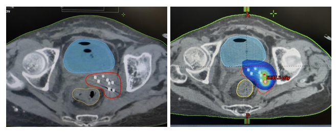 操作完成后再次采集患者盆腔CT定位图像,然后由医生在二次CT图像上进行靶区勾画,物理师赵强设计制作了放射源分布合理的治疗计划,审核通过后对该名患者实施了高剂量率三维插植后装放疗。