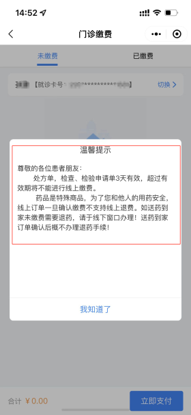 2阅读温馨提示后在线缴处方、检查、检验等费用