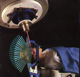 依据这个原理,医生们把一定量的放射线通过设备聚焦后,通过立体定向技术让焦点精确地落在人体内的肿瘤上,就可以完全毁灭性地杀死肿瘤,就如同“刀”一样切除肿瘤。甚至可以按肿瘤的形状“雕刻切除”肿瘤,其效果比真正的手术刀切除更完美。这一治疗技术就叫立体定向放射治疗。