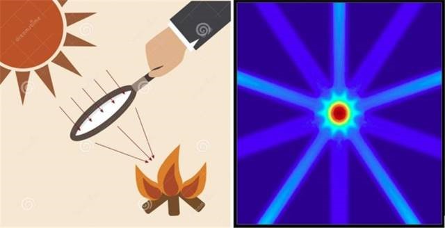 了解放射线聚焦照射技术之前,先让我们一起回忆一下,在中小学或儿时玩的放大镜。当你手拿一个放大镜(凸透镜),在太阳下把阳光聚焦在纸片或木屑上时,焦点上的温度很高,可以引燃纸片或者木屑。