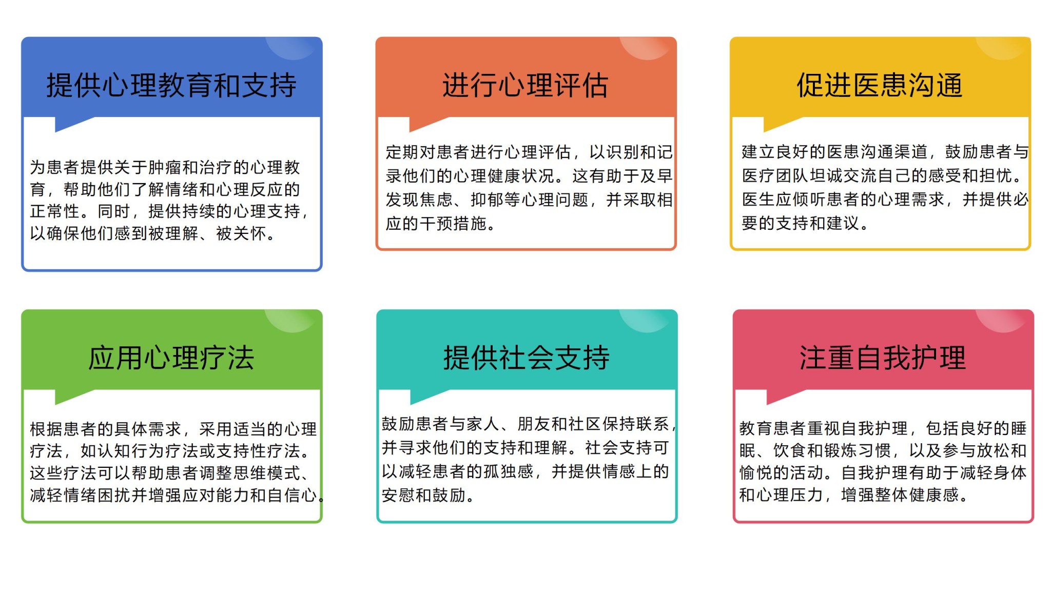 总之,肿瘤患者的规范化诊治不仅需要关注身体上的疾病,也要重视患者的心理状况。通过综合治疗手段包括心理教育和支持、心理评估、促进医患沟通、应用心理疗法、提供社会支持、注重自我护理等措施可以有效地改善肿瘤患者的心理状态和生活质量。