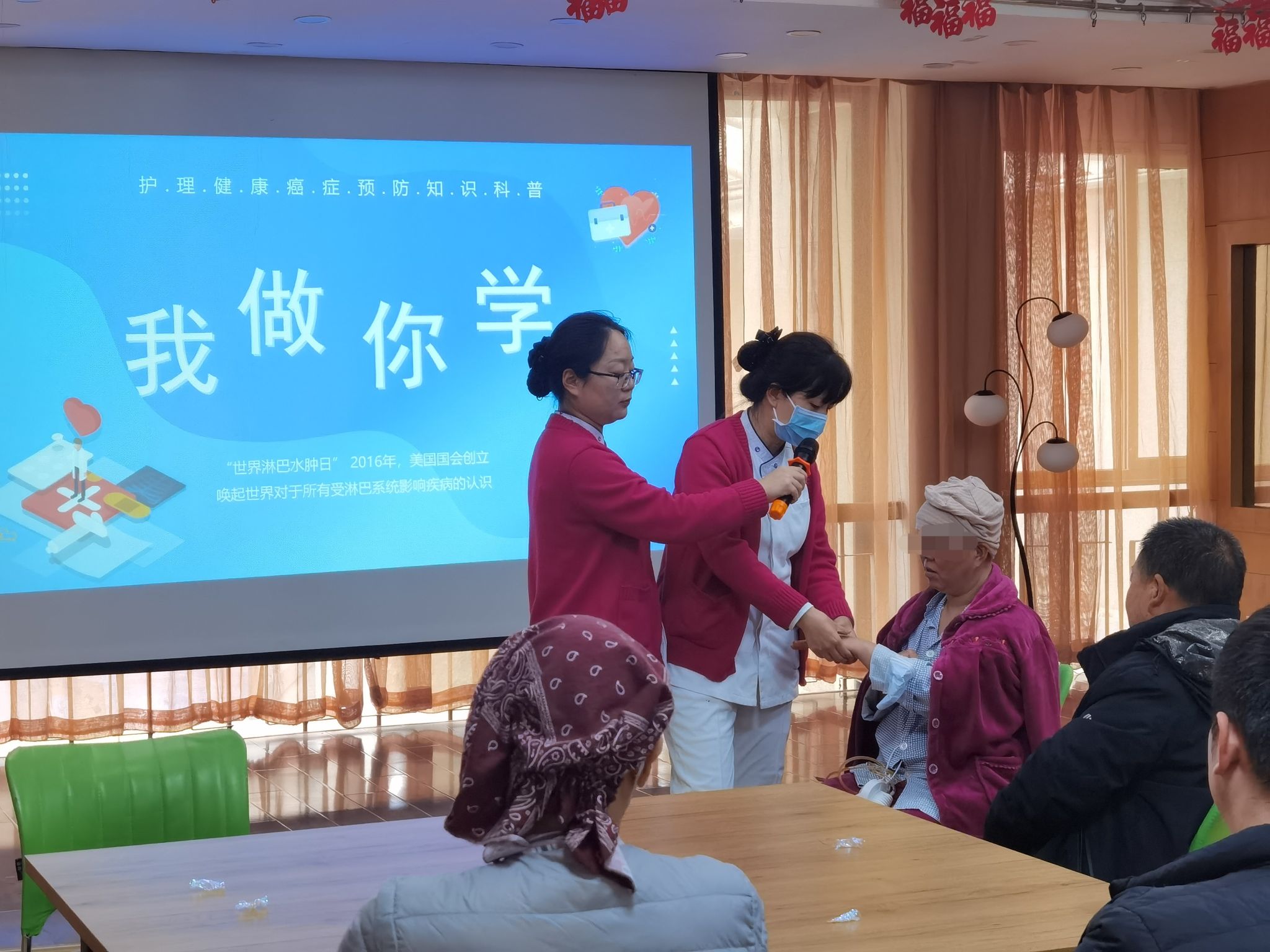 3月6日下午,乳腺病院一病区开展“我做你学”主题患教活动与患者共迎佳节。活动中,病区护士为患者进行“淋巴水肿科普知识”的科普宣教,带领大家一起做淋巴水肿预防操,并回答患者的疑问