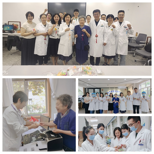 在临床病区,党委副书记姚俊涛与退休志愿者原检验科吴菊梅老师、工会、离退休办负责人和党务部工作人员一起将400多个香包送到临床医护人员和患者手中,并为他们送去最真挚的节日祝福。