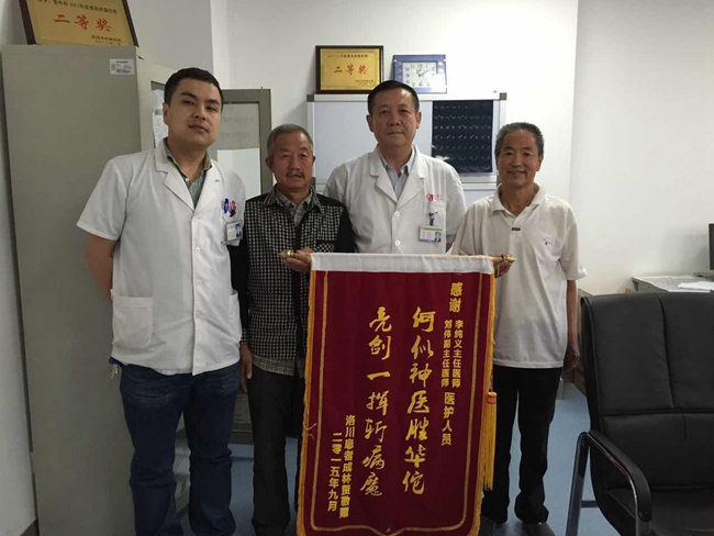 (普外一科 张洁摄) 今早晨会患者家属冒雨送锦旗,感谢李纯义主任及普外一科全体医护人员,让我们很受感动!