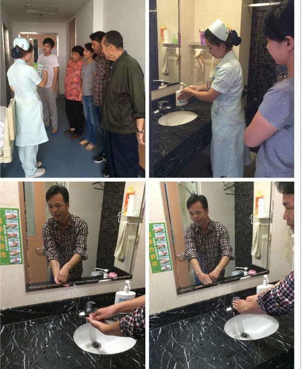 预防疾病,从正确洗手开始___临床上特殊感染的患者越来越多,放一科把六步洗手法作为九月份的健康教育内容,指导家属预防交叉感染。 (放疗一病区 杨志华摄)