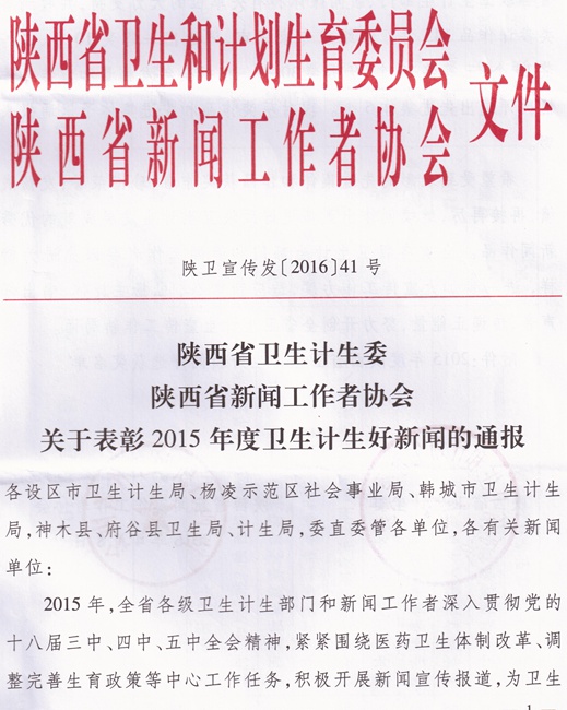 素股2篇新闻荣获陕西省卫生计生委2015年度卫生计生好新闻奖